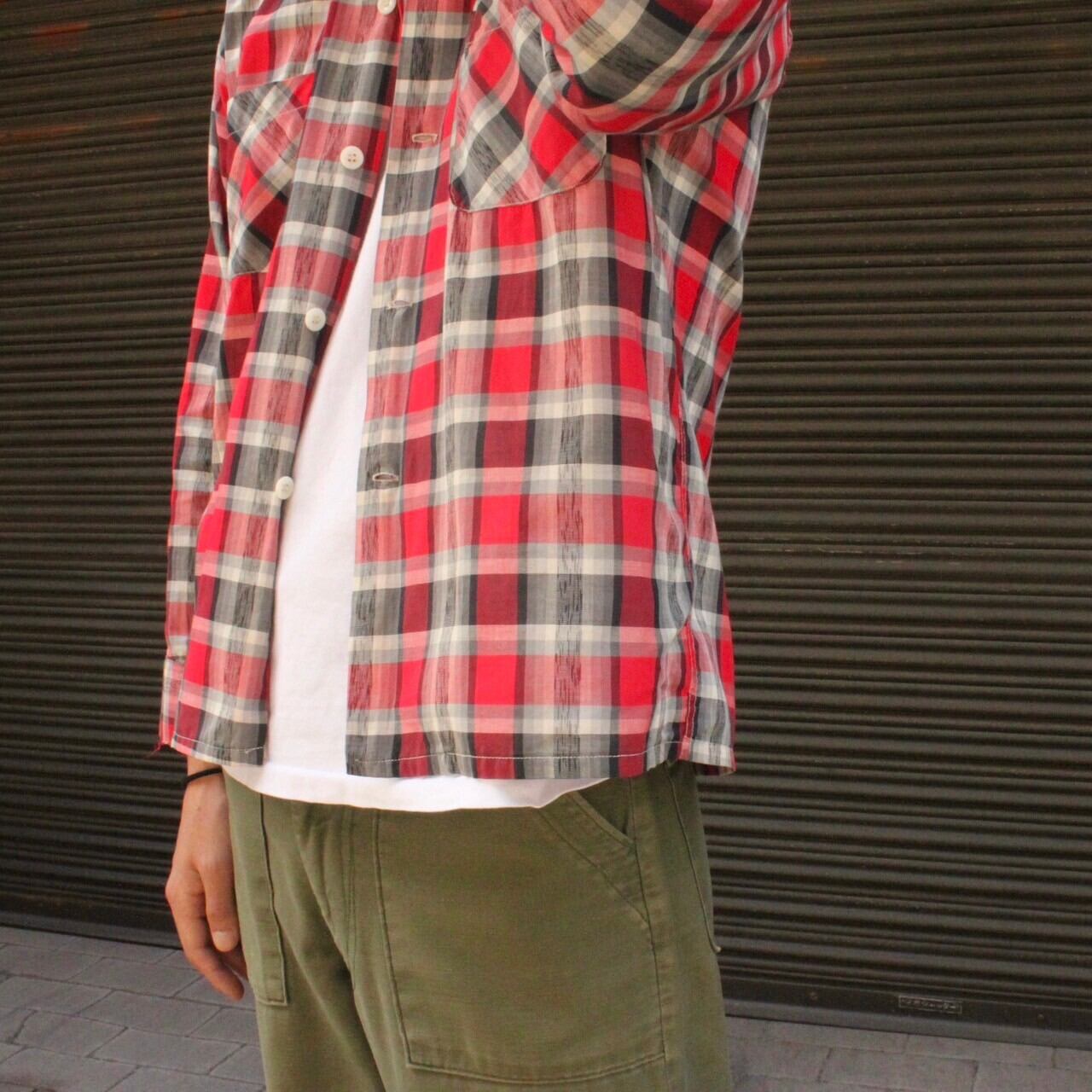 正直な話赤とカーキが似合わないわけないんです。しかもただの赤じゃなくチェック柄の中にかすりのラインが入ってる洒落こい一枚。バナリパのTシャツも形といいバックプリントといい、見たらわかるいいTシャツです。それらをまとめるコットンサテンのベイカーパンツ、言うことないですね。どれもおすすめです。
